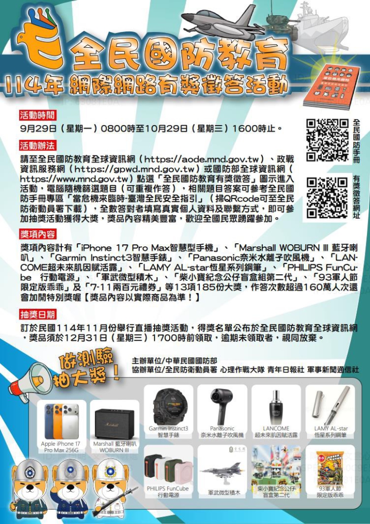 國防部為增進全民國防知識及防衛國家意識,藉辦理「網際網路有獎徵答活動」擴大全民國防教育成效,辦理網際網路有獎徵答活動。活動期程自114年9月29日8時至10月29日16時止,進入全民國防教育全球資訊網、政戰資訊服務網、國防部全球資訊網及國軍內部網路點選「全民國防教育有獎徵答」圖示,系統隨機篩選題目(可重複作答),全數答對者在網站留下個人基本資料與聯繫方式,即可參加抽獎,歡迎踴躍參加。