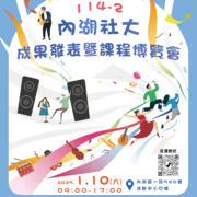 【活動資訊】內湖社大期末成果展|一起見證學習的力量!2025-12-26/在: 最新消息 一個學期的努力,將在這一天閃耀登場 日期|115/1/10(六) 時間|09:00~17:00 新生好康|當天報名課程,享100元證件製作費優惠,手刀搶名額! 地點|內湖高工4樓活動中心(內湖路一段520號) 交通小秘訣|捷運-港墘站2號出口,步行超方便! 活動直播網址|https://www.youtube.com/watch?v=B1_FAIgPNNs 現場亮點: 美術、攝影、DIY手作作品 × 創意滿滿 舞台表演 × 熱舞、吉他歌唱、太極拳示範 不論是正在學習的學員、想找新興趣的鄰居, 都歡迎一起來感受「學習讓生活更美好」的能量! 快揪朋友來逛逛,留下今年最充實的一天 https://www.nhcc.org.tw/wp-content/uploads/2025/12/114-2成果展-02-scaled.jpg 2560 1871 news https://www.nhcc.org.tw/wp-content/uploads/2024/07/網頁Logo_工作區域-2.png news2025-12-26 20:37:442025-12-26 20:37:44【活動資訊】內湖社大期末成果展|一起見證學習的力量!