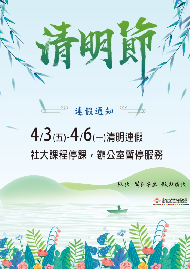 4/3(五)至 4/6(一)暫停上課及辦公。