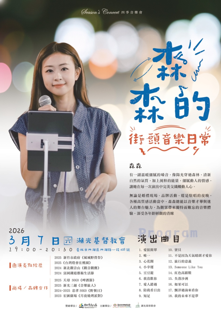 內湖社區大學與湖光基督教會攜手舉辦的「四季音樂會」系列,三月份邀請到擁有溫暖嗓音的歌手——森森。