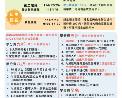 P.4- 舊生報名其他課程: 114/12/29至115/1/3修正為1/9(學分費優惠100元)